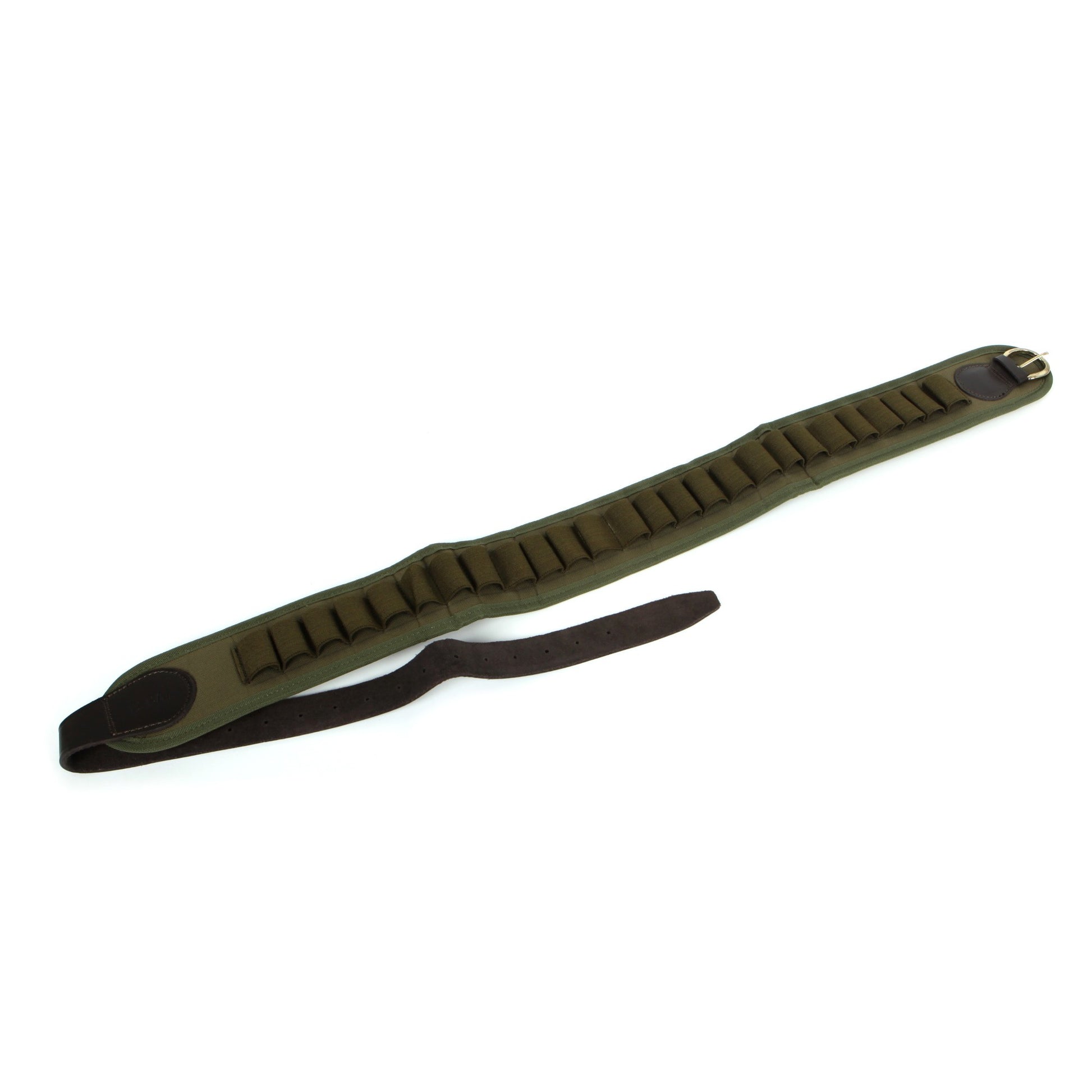 26 paikkainen patruunavyö haulikon patruunoille. Pidikkeet joustavaa kangasta johon paukut on helppo pujottaa. Pituus 87cm-125cm, leveys 8cm. Materiaali nahka ja polyesteri.