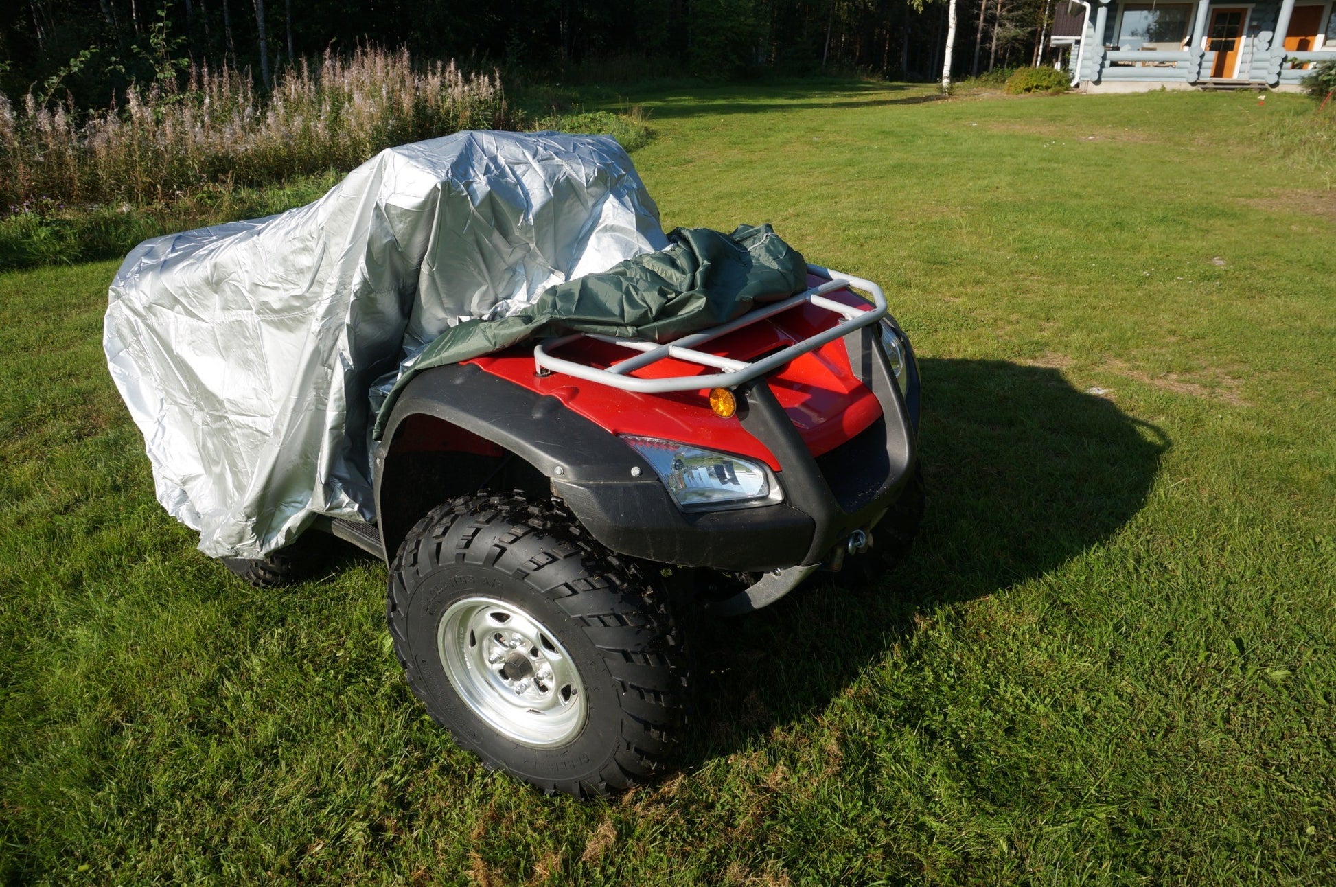 Ympärivuotiseen käyttöön tarkoitettu mönkijän suojapeite. Vettähylkivä materiaali pitää mönkijän kuivana peiton alla. Materiaalina on silikonikäsitelty PE kangas. joka on myös pakkasen kestävää. Pakattu läpinäkyvään vetoketjulliseen laukkuun. Koko: 251 x 125 x 85cm .VAROITUKSET! Peitettä ei saa käyttää kolmeen (3) kuukauteen mönkijän maalaamisesta normaalimaaleilla eikä kuuteen (6) kuukauteen metallihohtomaaleilla maalaamisesta. Poista märkä peite mönkijän päältä ja kuivaa se välittömästi käytön jälkeen. Säilytä sitä mönkijän säilytystilassa tai muussa kuivassa paikassa. Myyjä/maahantuoja ei vastaa peitteen väärinkäytöstä johtuvista vahingoista.