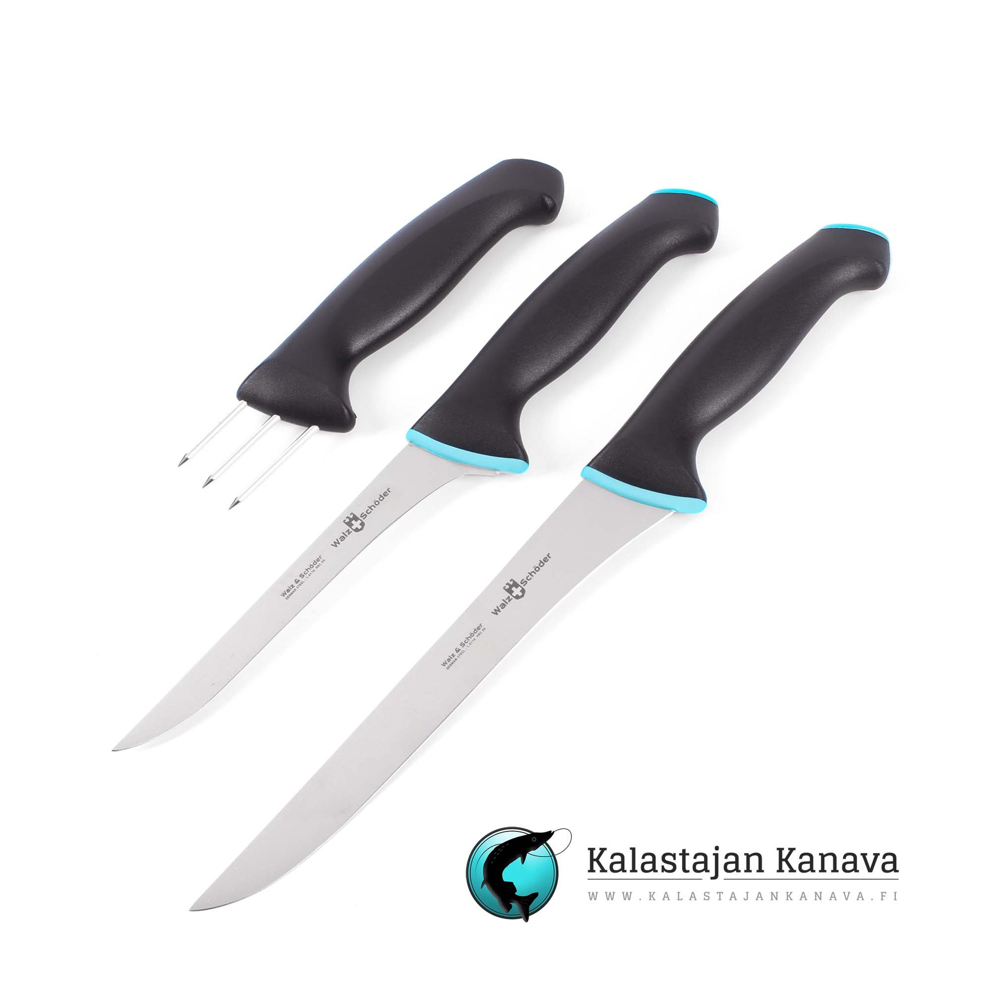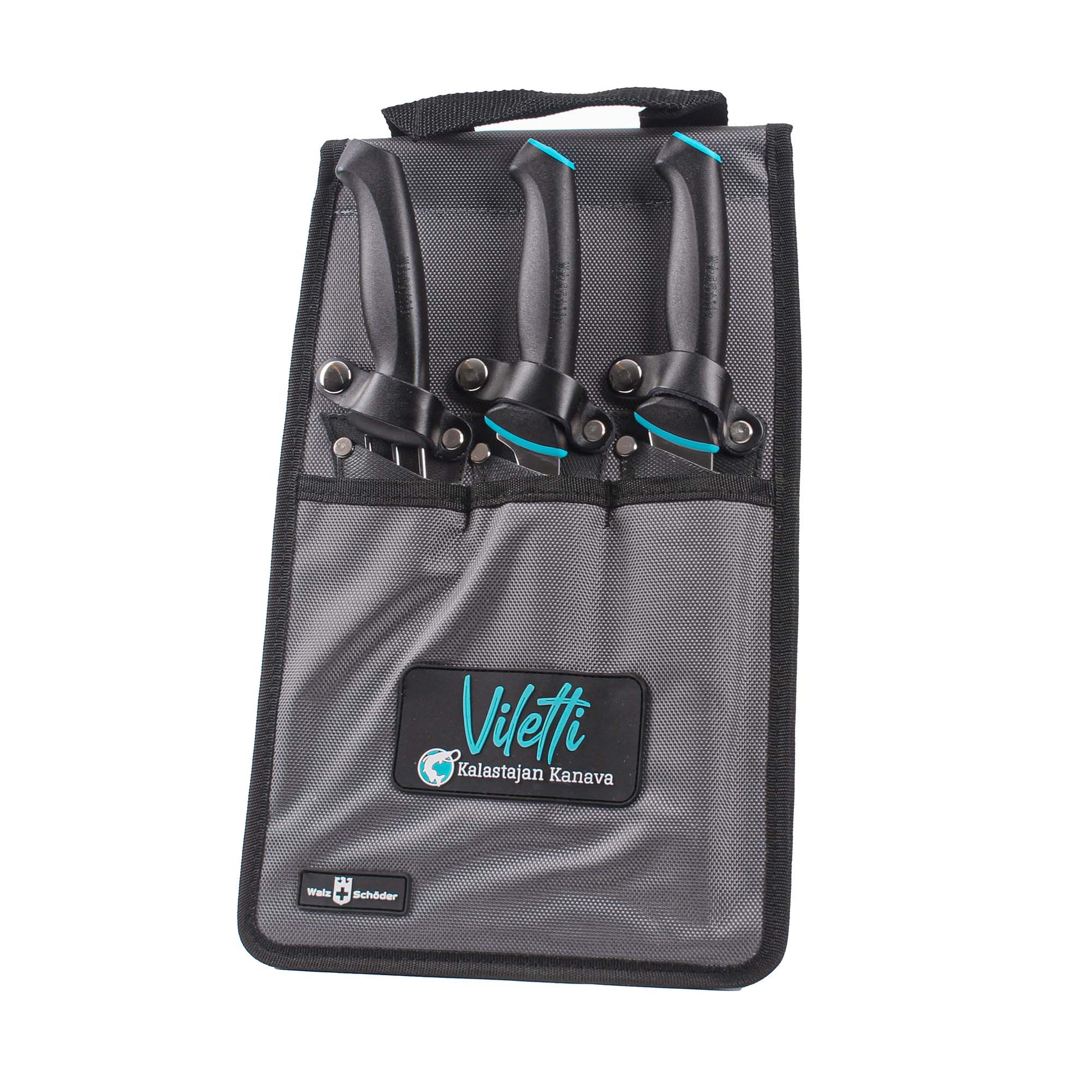 Viletti – veitsisarja on kaikille kalan käsittelijöille erinomainen valinta. Viletti sarjassa on tukeva kalapiikki, fileveitsi ahvenelle ja kuhalle, sekä hauelle oma fileveitsi. Molemmissa veitsissä sekä kalapiikissä on miellyttävä TPR-kahva, joka takaa hyvän otteen.Tekniset tiedot:Kalapiikki: Piikkien pituus 40mm, halkaisija 2.5mm. Miellyttävä TPR-kahva.Pikkufiletti: Terän pituus 140mm, joustava. Terän alkuperämaa Saksa. TPR-kahva.Isofiletti: Terän pituus 190mm, medium joustava. Terän alkuperämaa Saksa. TPR-kahva.Laukku: 1000D Polyesteriä, suojatut teräkotelot. Kantokahvalla. Mitat 240mm x 370mm.