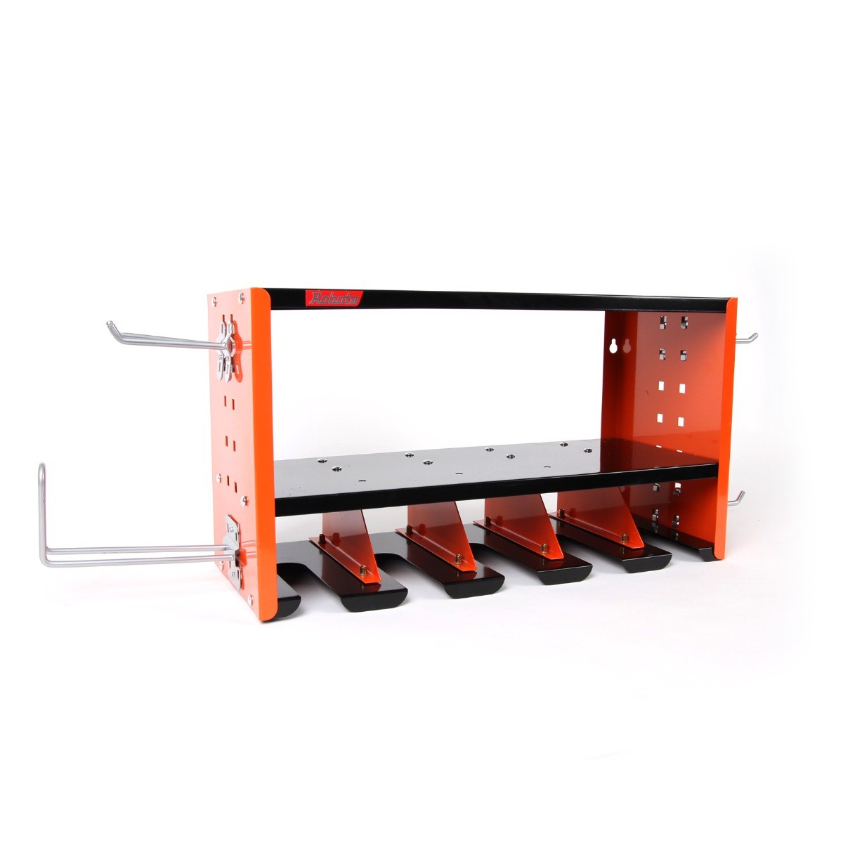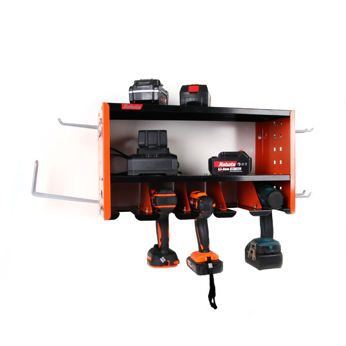Robota mallisarjan akkuporakonehylly autotalliin. Tällä telineellä järjestät työpisteen kuntoon. Koneet ovat kätevästi otettavissa sekä saat akut ja laturit samaan hyllyyn. Lisätarvikkeita varten telineen päädyt valmistettu reikälevystä johon käyvät yleisimmät reikälevypiikit (reikäjako 38mm). Telineen mukana tulee toki jo mukava määrä piikkejä.Materiaali: Pulverimaalattu teräslevy Mitat: Leveys 51cm, Syvyys 21cm, Korkeus 28cm
