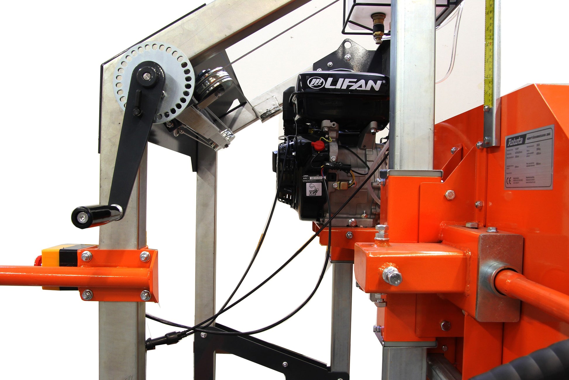 Nyt mukana säädettävä teräohjuriRobota kenttävannesaha on erittäin monipuolisena sahauslaitoksena hyvin suosittu. Kenttävannesaha on tunnettu hyvästä laadusta, monipuolisista käyttömahdollisuuksista, hyvästä maineesta sekä edullisuudesta johtuen. Tällä sahalaitoksella sahaat monipuolisesti kaiken mitä tarvitset. Tämä sahalaitos on erittäin taloudellinen verrattuna perinteiseen sahalaitokseen. Ohut vannesahan terä kuluttaa vähän energiaa joten sahalaitosta voidaan pyörittää pienemmällä moottorilla joka taas syö vähemmän polttoainetta.Robota kenttävannesahalla voidaan sahata aina 55-60cm halkaisijaltaan olevia tukkeja joiden pituus on n.3.2m käyttäen vakiosahauspöytää. Mikäli halutaan sahata pidempiä tukkeja sahauspöytään on saatavana erillinen jatko jonka avulla tukkien pituus kasvaa yli 5.2m pituuteen. Sahalaitoksella voidaan sahata kaikkia puutyyppejä. Tukit kiinnitetään sahauspöydälle tukkipuristimien ja sivutukien avulla. Sahauspään korkeus joka myös määrittelee sahattavan puutavaran paksuuden säädetään tarkasti erillisellä kammella. Kampi on lukittava joka takaa sen, että korkeus ei sahauksen aikana pääse muuttumaan. Itse sahaus suoritetaan liikuttamalla sahauspäätä eli kellkkaa tasaisesti eteenpäin jolloin terä osuu tukkiin ja alkaa sahaamaan. Kun sahaus on valmis, sahauspää palautetaan vetämällä takaisin ja lasketaan seuraavaan sahauskohtaan.Sahauslaitoksen yläosassa on vesisäiliö josta johdetaan vettä voiteluksi suoraan terälle. Vedensyöttämisellä saadaan aikaiseksi parempi sahaustoiminto ja terä pysyy veden ansiosta puhtaana. Terän takana on erillinen ohjausvarsi joka tukee terää sahauksen aikana. Tällä saavutetaan tarkka ja suora sahausjälki. Terän kireyden säätö on yksinkertaista ja terä pysyy kiristettynä oikealla tavalla koko ajan kun sahataan. Robota kenttävannesahan avulla hukkaa tulee todella vähän.Käyttökohteet Kenttävannesahaa voidaan käyttää normaalin laudan, lankun jne. sahaukseen. Tämän lisäksi saha on erinomainen valinta esim. D hirren valmistajalle jossa puun yksi sivu ajetaan sileäksi. Sahalla on kätevä tehdä pitkospuita, isoja erikois lankkuja, pöytäpuita, venepuita, pelkkahirttä ja monia muita tuotteita.LisävarusteetSahan mukana toimitetaan 2m pituinen jatkopöytä + säädettävä teränojain. Varateriä on saatavana erikseen ja mahdollisessa ongelmatilanteessa meiltä löytyy varaosia koneeseen ja sahaan.Tekniset tiedotMoottori: 270cc, 9hp Lifan nelitahti moottori, käsi käynnistysSahaus kapasiteetti: ø660mm maxRunko-osa: Koostuu nejästä kisko-osasta, pankoista ja tukijaloistaTerän koko: 3670*34*0.9mmTerän nopeus: 17m/sekTerän hampaiden väli: 22mmTerän kääntöpyörän halkaisija: ø475mmSahalaitoksen koko: 4064*1778*1800mmKiskon koko: 4042x900mmKenttävannesahan pakkauksen koko: 220x90x60cmKysy lisääPuh. 040 592 6821Kenttävannesahan ohjekirja ja lisätietoja sahasta tästä linkistätukkivannesaha vannesaha kenttäsaha sahalaitos