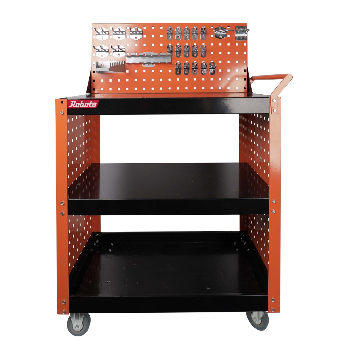 Robotan mallisarjan reilunkokoinen avohyllyinen työkalukärry työkaluseinällä ja reilulla määrällä työkalupiikkejä sekä ripustimia. Vaunulla kuljetat tarvittavat työkalut kätevästi työpisteelle. Huollettavan kohteen osat pysyvät tallessa vaunun laidallisissa hyllyissä. Reikälevypäädyt vaunun molemmissa päädyissä mahdollistavat työkalupiikkien käytön (reikäjako 38 mm). Pakkauksen sisältö: Vaunun reikälevypääty 2 kpl, Hyllypellit 3 kpl, Reikälevytaulu 88cm x 46,5cm 1 kpl , Reikälevytaulun kiinnikkeet 2kpl, Vetokahva, 2 kpl kääntyviä 75mm pyöriä jarrulla, 2 kpl kiinteitä 75mm pyöriä, Kasausruuvit.Työkalupiikit: Työkalupiikki 5cm 10kpl, Työkalukaksoispiikki 50mm 5kpl, Työkalupiikki 10cm 5kpl, Rengaspiikki halkaisija 50mm 1kpl, Rengaspiikki 90mm 1kpl, Meisseliteline 6:lle meisselille, Kiintoavainteline 8:lle avaimelle.Vaunun mitat: Pituus 935 mmSyvyys 465 mmKorkeus 1230 mm Paino: 24,6 kg Materiaali: 1 mm:n pulverimaalattu teräslevy