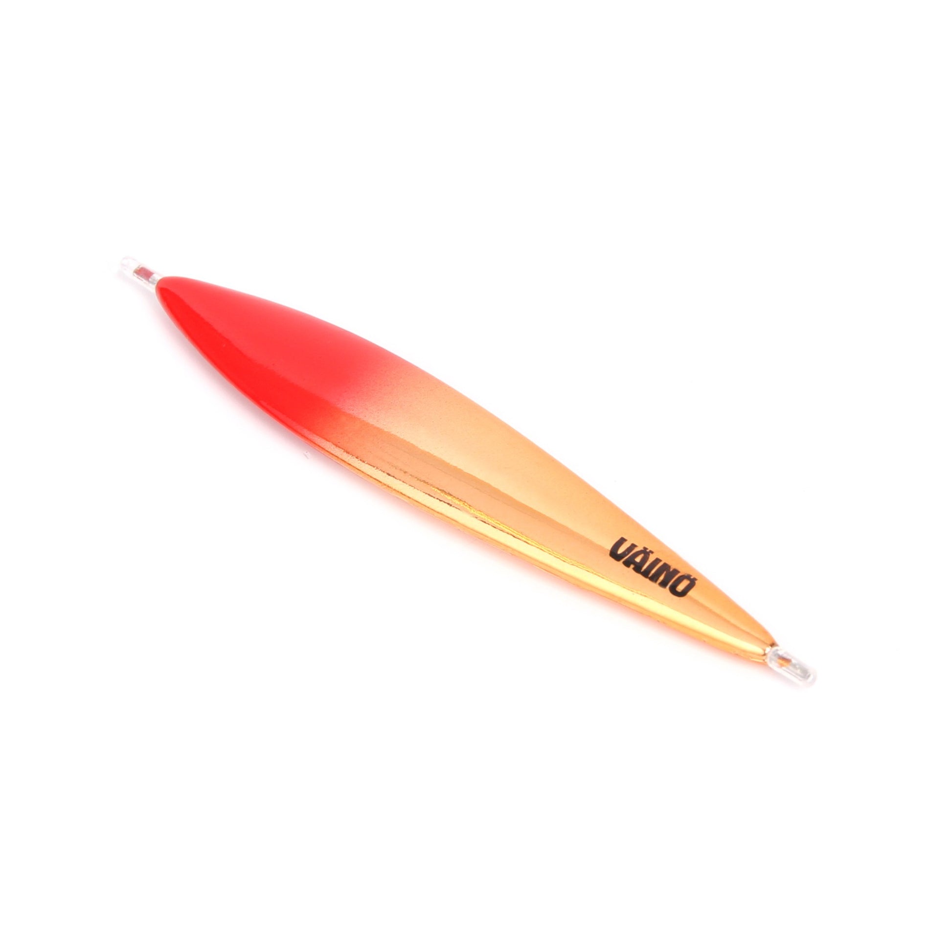 "Väinö kevennetty liukupilkki yhdistää samaan pakettiin kaksi viime vuosien muotitrendiä eli liukupilkkiominaisuuden ja kevennyksen. Metallisen ytimen päällä on reilu kerros muovia, joten 105-millisenäkin pilkki painaa vain 11 grammaa. Keveydestään huolimatta Väinö sukeltaa melko sutjakkaasti ja suoraviivaisesti, mutta terävillä nykyillä sen saa myös liitelemään sivusuunnassa. Pakkauksessa mukana tulee fluorihiilitapsiin solmittu kultamorri, onpa tapsissa jo pilkin kiinnityksessä tarvittavat silikoniputken pätkätkin valmiiksi pujotettuna. Kannattaa kokeilla erityisesti ahventen narraamisessa."