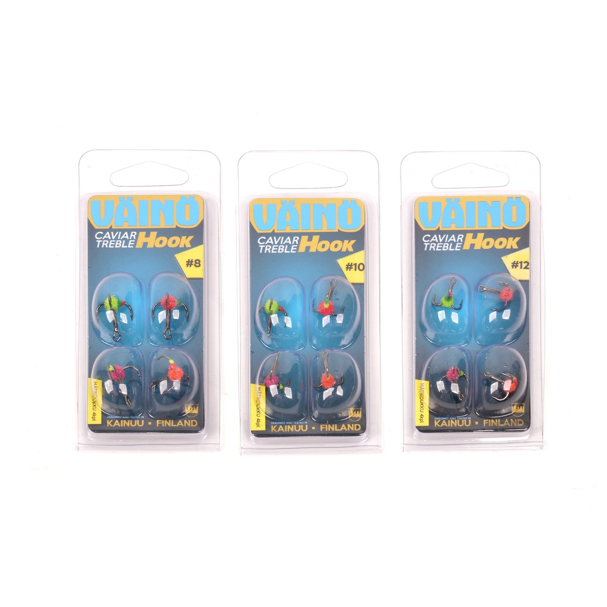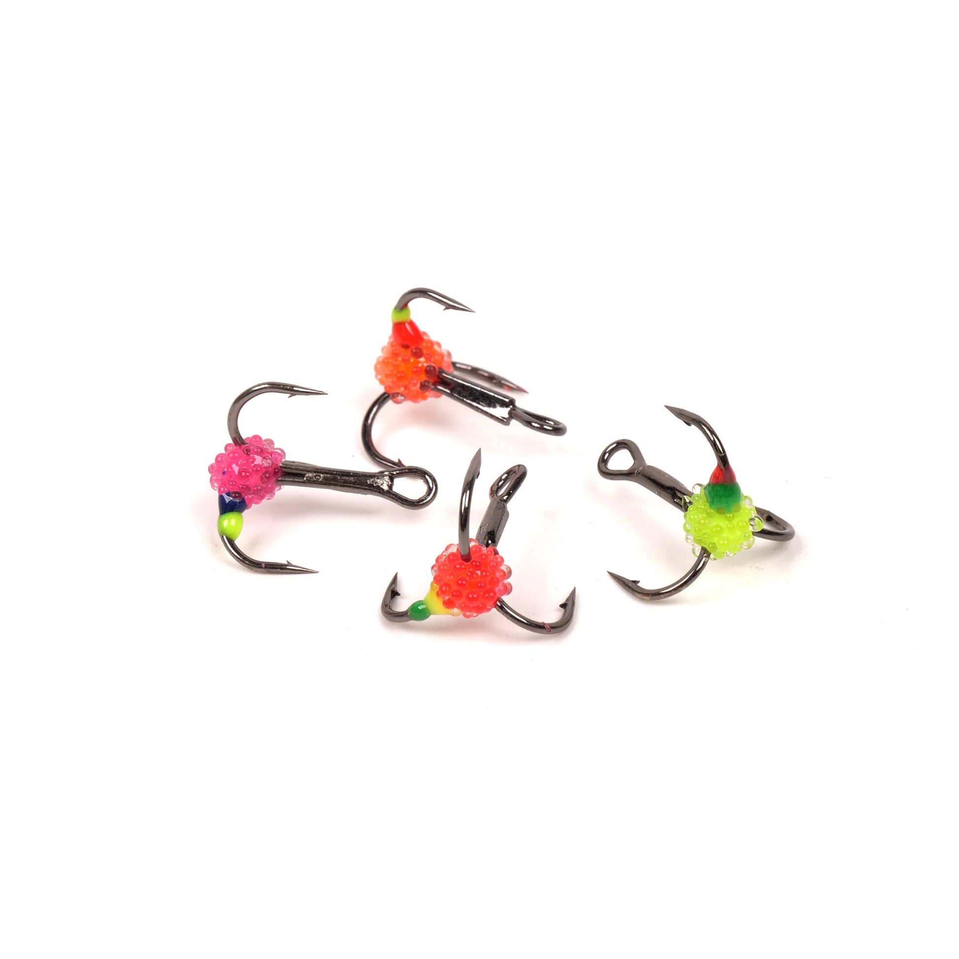 Kolmihaarakoukut joissa on kalan mätikuulia jäljittelevä värillinen pinta toimivat minkä tahansa vieheen kanssa mutta erityisen hyvin pysty- ja tasapainopilkkien kanssa. Korkealaatuinen kemiallisesti teroitettu koukku joka tartuttaa kalan varmasti.